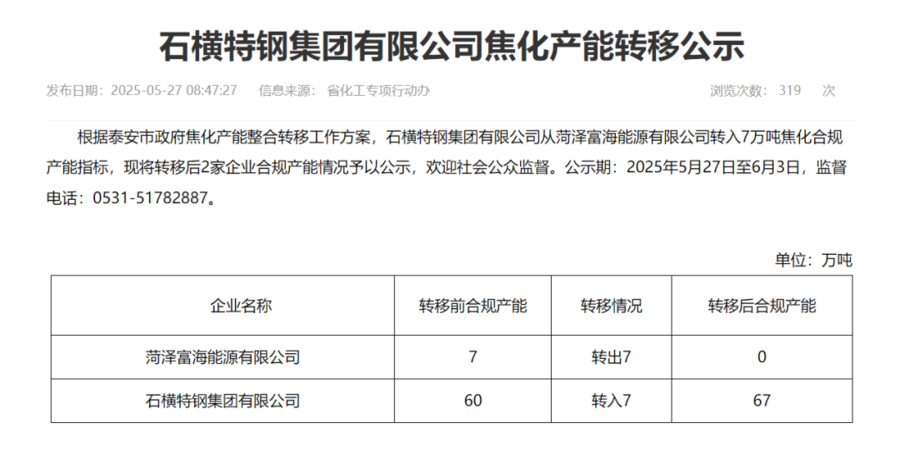 公示称,根据泰安市政府焦化产能整合转移工作方案,石横特钢集团有限公司从菏泽富海能源有限公司转入7万吨焦化合规产能指标,现将转移后2家企业合规产能情况予以公示,欢迎社会公众监督。公示期:2025年5月27日至6月3日,监督电话:0531-51782887。