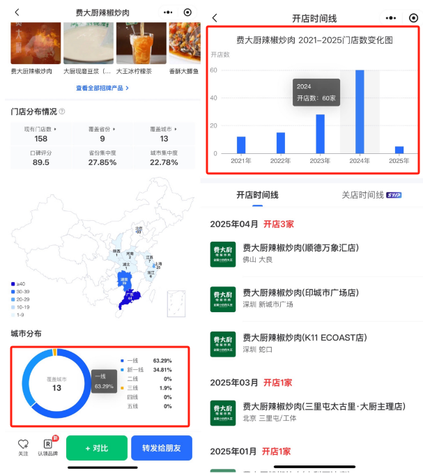 《中国炒菜餐厅行业发展白皮书》显示:辣椒炒肉是国民炒菜第一。凭借大单品路线和厨师标准化,费大厨顺利走出湖南,并进入深圳、上海、北京、广州等一线城市。据窄门餐眼数据,费大厨拥有158家门店,绝大部分集中在一线和新一线城市,超60%为商场店。去年以来,费大厨加速扩张,一年新增门店60家。